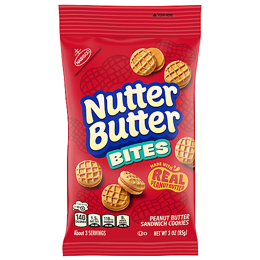 Nutter Butter Bites Peanut Butter Sandwich Cookies are The Peanut Butter Lovers' Cookie in a bite-sized, mini round shape. Sweet and savory peanut butter snacks, these mini cookies have a crunchy texture and a smooth, creamy filling made with real peanut butter between two crispy cookies. Nutter Butter Bites sandwich cookie snacks feature a peanut shell-texture design on the cookies, making snacking fun for all ages. Enjoy these certified kosher snacks on their own or try dipping them in a glass of milk. You also can use these sweet snacks as party favors, stocking stuffers, Easter basket fillers, and Halloween treats. Packaged in big bag snack packs that are wonderful on the go snacks for anytime and anywhere, these snack cookies also make fantastic lunch snacks, office snacks, and road trip snacks.