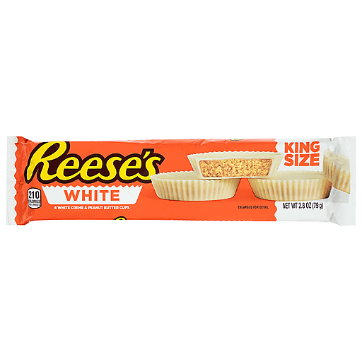 REESE'S white creme king size peanut butter cups are the classic REESE'S cups you know and love but coated with delightful white creme instead of milk chocolate. These delectable treats are easy to enjoy anywhere and anytime you need a sweet moment to yourself. This king size 4-pack of peanut butter cups is great for sharing with family and friends or enjoying on your own. Savor each decadent bite of creamy peanut butter surrounded by sweet and smooth white creme. REESE'S white creme peanut butter cups are kosher certified and gluten free for everyone to enjoy. Pack a few REESE'S white creme peanut butter cups in your lunch box or save a few in your backpack for later. These candies are also ideal for leaving out at parties and holiday gatherings. You can even add these sweets to some of your favorite dessert recipes for extra goodness. Break them up and add them to your cookie dough, sprinkle them on top of your brownies or dunk them in your ice cream sundae for a boost of white creme flavor. And don't forget about the holidays! Fill Valentine's Day gift bags, Easter baskets, Halloween trick or treat bags and Christmas stockings with a REESE'S candy classic.