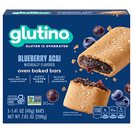 If you're looking to stock up on delicious gluten free snacks, grab a box of Glutino Gluten Free Blueberry Acai Flavored Oven Baked Bars. These tasty fruit bars feature the bright, fruity flavor of blueberries and acai inside of a soft baked crust. Each box contains 5 Glutino bars that make a great pantry food staple for you to always have on hand. Just throw these individually wrapped snacks in your bag to enjoy as a breakfast bar or convenient office snacks throughout the day, whenever you're craving them. Each blueberry acai bar is naturally flavored, certified gluten free and Non-GMO Project Verified so you can feel good about your snacking. Glutino: Wildly Delicious. Gluten Free.